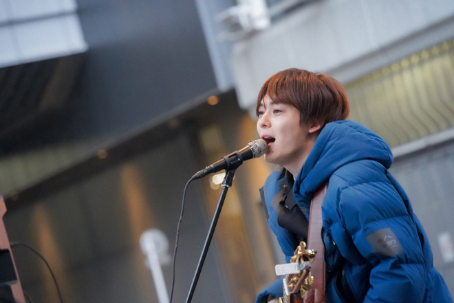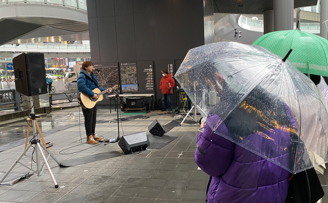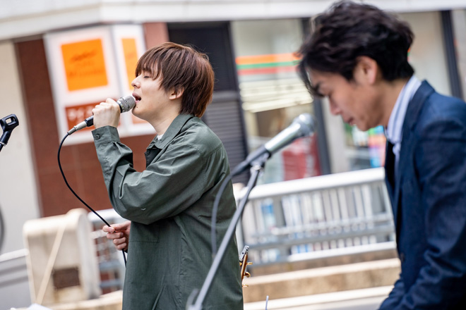 ここでついに機材が復旧。三度、「スターマイン」のアカペラパートを熱唱すると、今度はしっかりトラックが流れ出し、アップテンポなビートに乗せて力強い歌声を聴かせた。サビでは、岸が手をふり挙げる振りを披露し「一緒に!」と促すと、観客は傘の中で小さく手を振り上げて応えて、楽し気な雰囲気が広まっていった。歌い終えると、ひと際大きな拍手が沸き起こり、それが周囲のビルなどにこだまし、何だか摩訶不思議な雰囲気になったのも印象的だった。