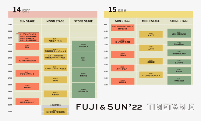 5月14日と15日に静岡県富士市の「富士山こどもの国」で開催されるキャンプフェス<FUJI & SUN ’22>のタイムテーブルが公開された。