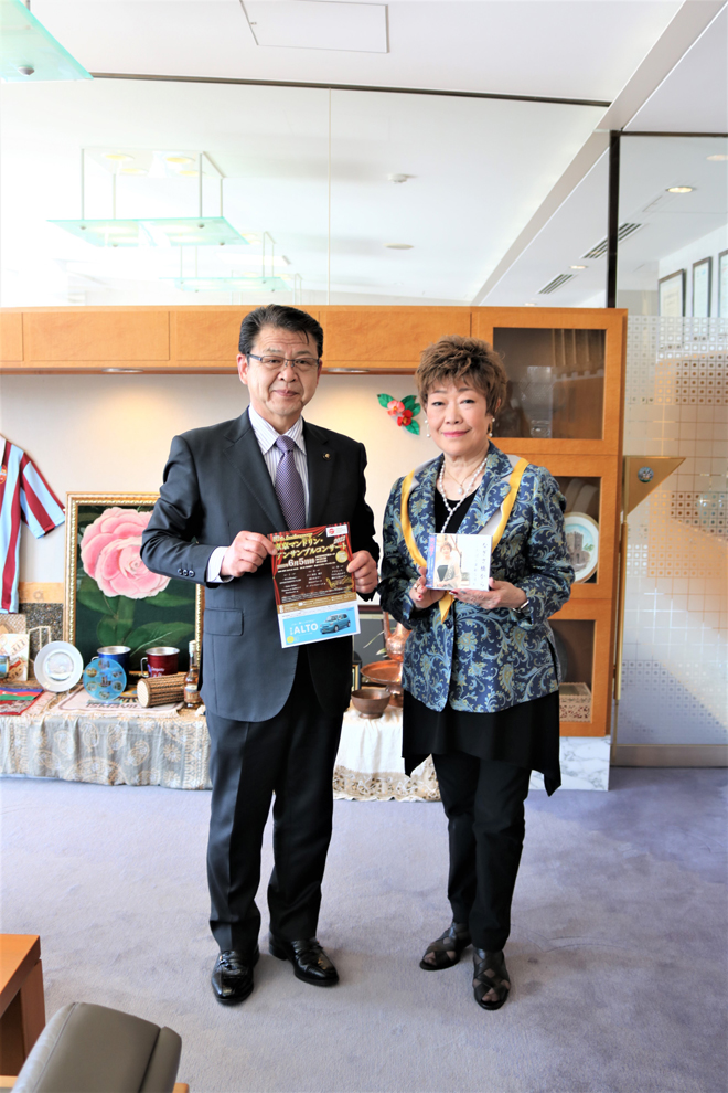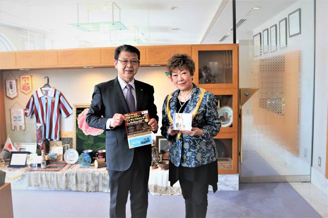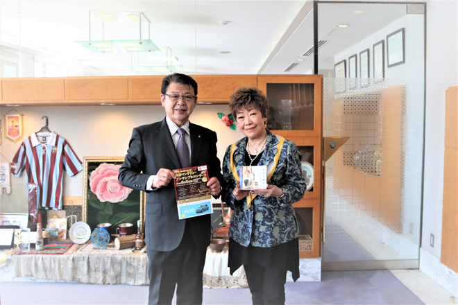 秋元順子が4月12日に静岡県の伊東市役所を訪れ、小野達也市長を表敬訪問した。