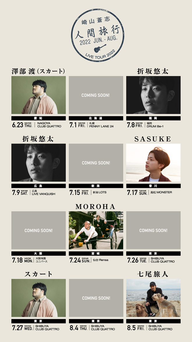 「人間旅行」とは、2020年に崎山が初の自主企画として開催した対バンイベントのタイトル。今回も、崎山自身が敬愛するミュージシャンを各会場にゲストとして迎え、この旅を全国展開する。またこのたび、その第一弾ラインナップ発表も行われ、澤部渡(スカート)、折坂悠太、SASUKE、MOROHA、七尾旅人の出演が発表された。本日より、公式モバイル「崎山寝返りの湯」にてチケット先行がスタートしている。