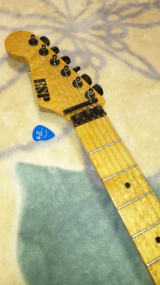 左利きにつき使うギターの選択肢が圧倒的に少なかった大学生当時、ESPはフルオーダーで製作してくれるってことで清水の舞台から飛び降りるつもりでオーダーしたストラトタイプのオリジナルモデル。バーズアイメイプルのネックだけで8万とか、貧乏学生にとっては数ヶ月の食費ですよ。