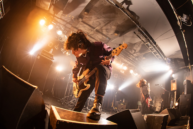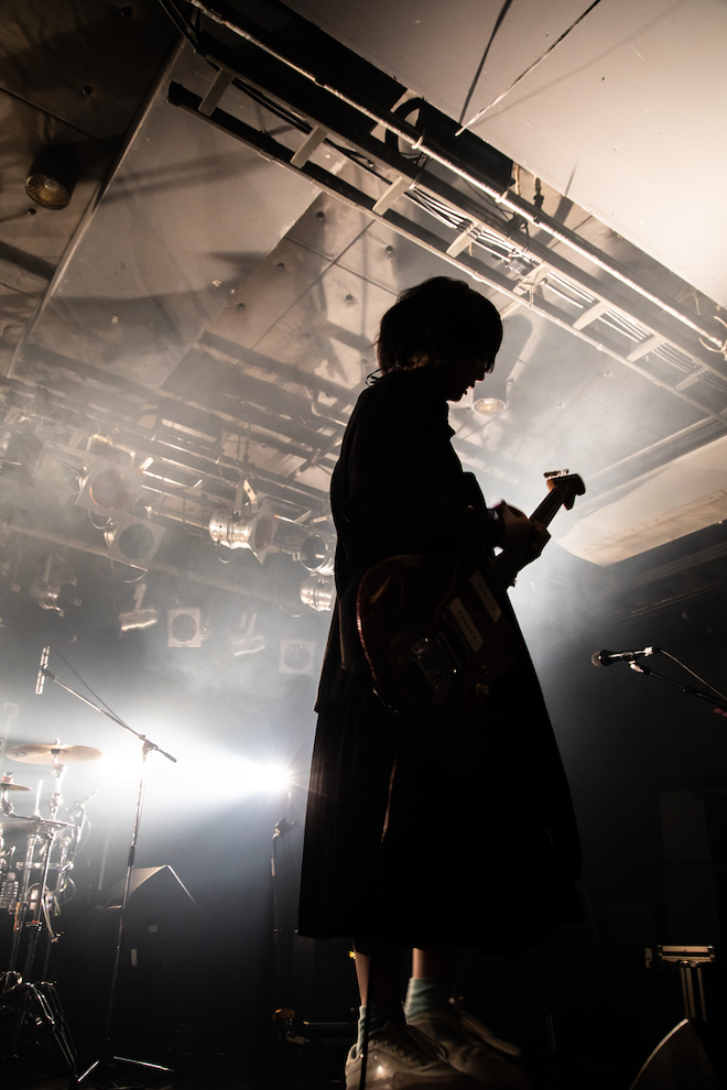 「どんどん行きます!」という片桐の一声で片桐とヤスカワが一斉に身を乗り出し、「どこにも行けない僕たちは」。これまでにShibuya O-EASTや渋谷CLUB QUATTROといった会場でワンマンを経験しているバンドゆえ、発信される音の密度が高い。3人が丁寧かつ強靭に音を繰り出すのと同じく、観客もその音を取りこぼさないようにと全身でそれを受け止めてゆく。時勢的に歓声でコミュニケーションは取れないが、だからこそ3人の音に観客の思いが染みわたり、より強固なものになっていたのかもしれない。