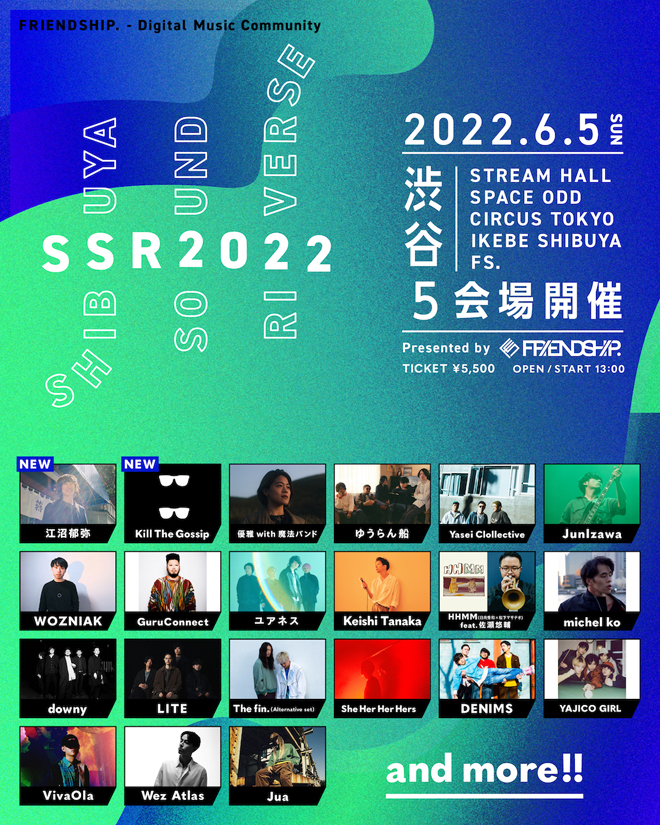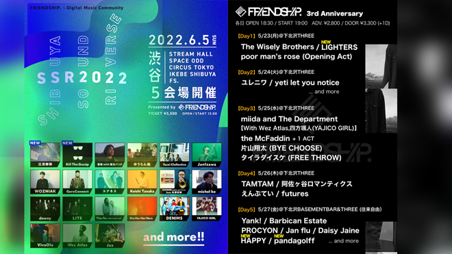 HIP LAND MUSICによる音楽ディストリビューションサービス「FRIENDSHIP.」がサービスローンチ3周年を記念して下北沢THREEにて開催する5daysイベント<FRIENDSHIP. 3rd Anniversary>、渋谷5会場サーキットイベント<SHIBUYA SOUND RIVERSE 2022>の出演者が追加アナウンスされた。