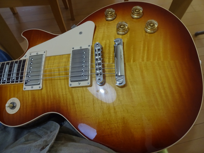 昔ながらのレスポールがよかったので、Traditionalをチョイスしました。色はHoney Burst(Cherry Sunburstと迷いました)、杢目のきれいさも気に入りました。フェンダーにくらべると、重い、音がでかい、と聞いていましたが、本当にそうでした。