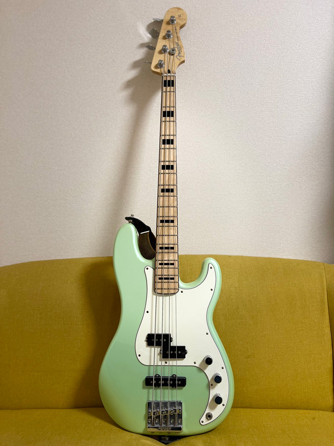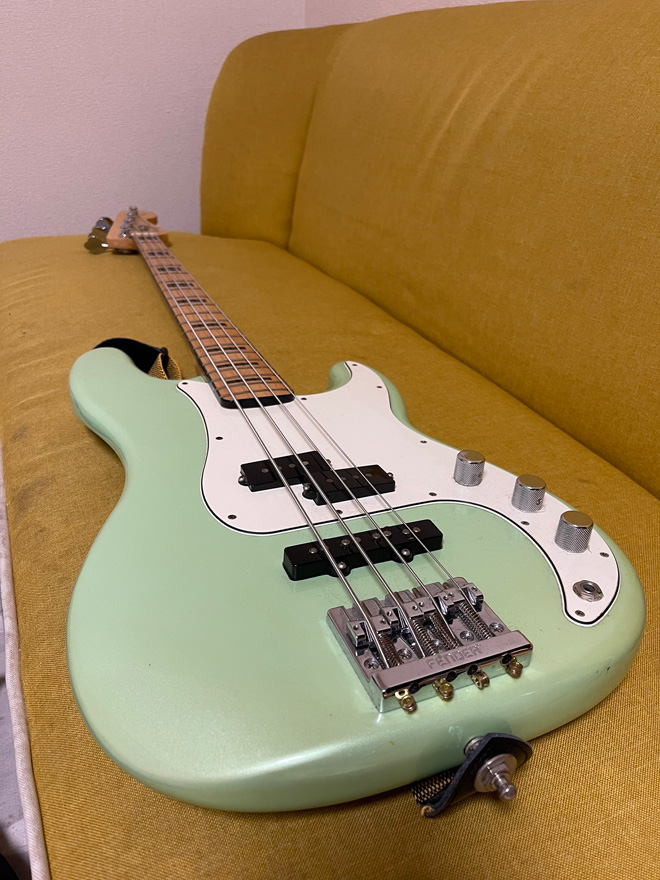 サーフグリーンがかわいい。プレベの実直な剛腕ぶりにジャズベの器用さとスタイリッシュさを採り込んだ仕様ですから、文句なしの一本ですよね。ギターセンターで購入したというのも、ストラップには現地の会話が紐づいているというのも、このプレベにまつわるお金では買えないエピソード。まさに思い出はプライスレスですね。(JMN統括編集長 烏丸)