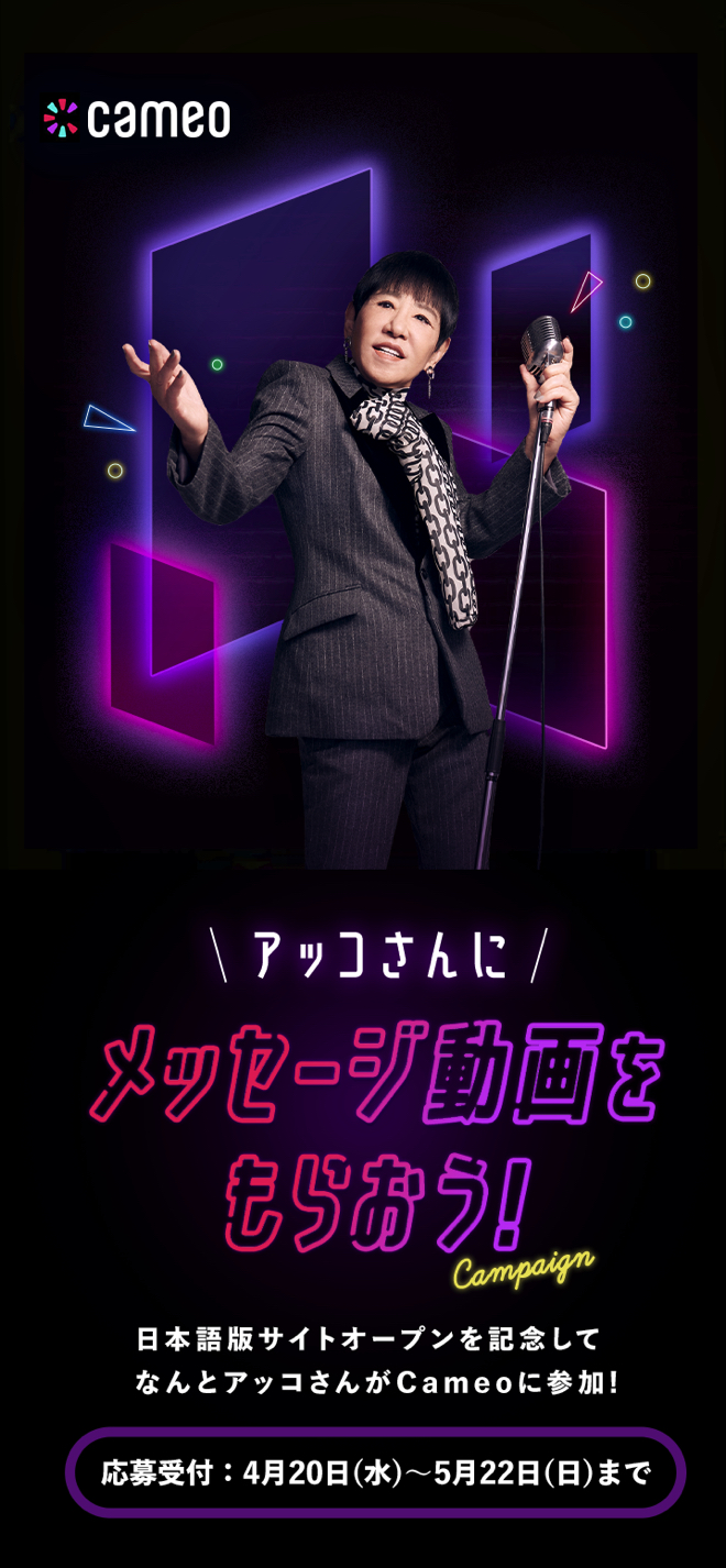 米Baron App, Inc.が展開するメッセージ動画プラットフォーム「Cameo(キャメオ)」の日本語版サイトとアプリが4月20日に本格オープンを迎えた。これを記念して、和田アキ子からメッセージ動画がもらえる<アッコさんにメッセージ動画をもらおう!キャンペーン>もスタートする。