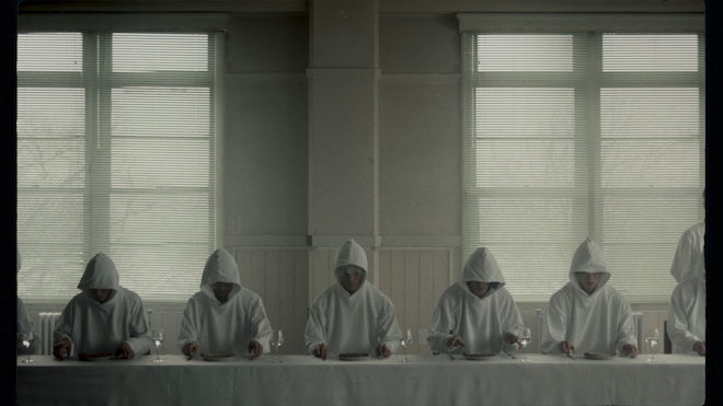 その後に続くのは、横一列に並んだ施設の住人が食事をとる最後の晩餐的な構図のシーン。食卓には全く彩りがなく、質素な肉が1枚のみで、本来あるべき食事の楽しみなど一切ない様子だ。このシーンでは背景、衣装、さらにKOYA自身も全て白を基調としていることにも気が付く。これはKOYAにとって施設での毎日は味気のない、何もない世界であることの表れだろう。そして“チャンスがないだけ運が悪いだけ 誰よりfly away想像中”という歌詞にもあるように味気のない毎日を他責にして、「本当の自分は周りとは違う」と鬱屈とした気持ちを抱いているのではないか。