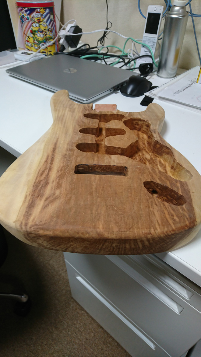 アッシュやアルダーと比べると比重が高く重硬なので低音のノビが良く高音が弱い傾向であることと、重量があるために弾く位置を高く想定してネック角度を左側に傾けています。