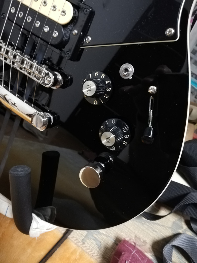 と、ここからが開発者の方々に申し訳無かったのですが、1時間位弾いてみて初めはとても気持ちよく弾いていたのですが段々、「1ヴォリューム・1トーン・5WAYスイッチだけだと歪み具合やヴァリエーションをヴォリュームやタップSWで操作するスタイルなので物足りない」「既存のPUは悪くないがもう少しパワーが欲しい」などの理由で、出会って3時間でとりあえず家に有るものを用いて以下の様に改造してしまいました。