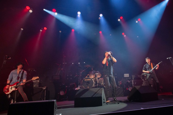 午後6時の定刻に場内が暗転すると、公演はまずオーケストラのみによる演奏でスタート。クラシカルにアレンジされた「MY FINAL DAY」をはじめとする5曲が披露された。その後、オーケストラと入れ替わる形でメンバー4人が登場し、今度はバンドのみによる演奏を披露。いわば通常通りの演奏が6曲続くと、今度は開演時のような正装ではなく全員が黒いバンドTシャツに身を包んだオーケストラが登場し、両者の共演がスタート。昨年10月にリリースされた『THE FINAL DAY』の30周年記念盤には同楽団の演奏による同作の楽曲群が収録されているが、両者のコラボ・タイムは同作の楽曲を中心とする構成。聴き慣れた愛着深い原曲が壮大なスケール感と深い奥行きを伴いながら提示され、興奮を呼んだ。