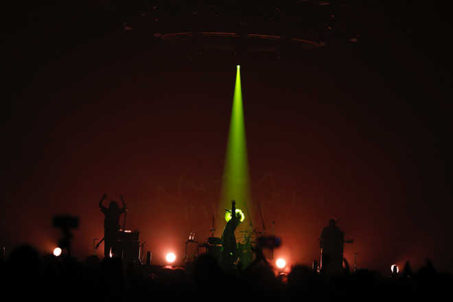 <THE PARADE>の第2幕はSEKAI NO OWARIとも親交があるマキシマム ザ ホルモン。SPACE COMBINEの「marchin’ mint flavors」のSEが轟く中、上手よりメンバーがステージに猛ダッシュ。ダイスケはん(キャーキャーうるさい方)の「アタマ振れるか!!」を合図にカウントが始まりオープニング曲「シミ」に突入。音がでかい。轟音だ。一分の空きもなく4つの声と4つの楽器が埋められていく。物凄い“圧”は、のっけから客席を圧倒。