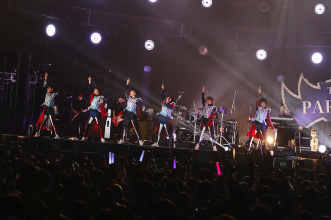 <THE PARADE>の3組目は“楽器を持たないパンクバンド”のBiSH。豪快なディストーションギターがかき鳴らされると、ステージ下手よりBiSHの6人が元気全開で走って登場。オープニングは代表曲でもある「BiSH-星が瞬く夜に-」だ。ハシヤスメ・アツコが「最高の夜にしようぜ!」と叫び、メンバーが横一線に並んでのヘッドバンキングを披露すると場内もこれに続く。1曲目から既に会場はヒートアップ。「DEADMAN」「遂に死」ではマキシマム ザ ホルモンばりにラウドロックを畳み込み場内を圧倒。