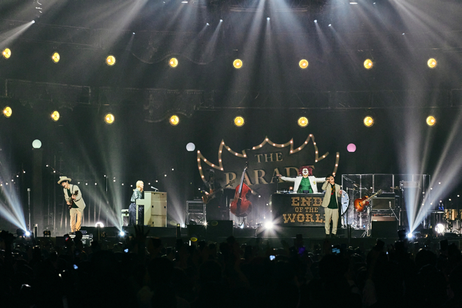 客席からのアンコールに応えて再びステージにSEKAI NO OWARIの4人が登場。Nakajinから「素晴らしい1日でした! こういう機会もめったにないので、みんなで記念撮影をしましょう!」とVaundy、マキシマム ザ ホルモン、BiSHらを呼びこみ客席をバックに撮影。出演メンバーがステージを降りると「みんなでジャンプしましょう! “Dragon Night”」とFUKASEが叫び演奏がスタート。Nakajinはギターにバンジョー、ドラムロールと八面六臂の演奏をみせ、Saoriはアコーディオンを抱え花道の左右を歩く。FUKASEの「ジャンプ!」に合わせオーディエンス全員がその場でジャンプ、圧倒的な盛り上がりの中、4時間30分に及んだ<THE PARADE>は終了した。