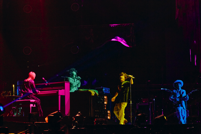 <THE PARADE>のイメージ映像が流れたあとステージは暗転。ギターのアルペジオがループで流れる中、Fukaseの声が響き渡る。オープニングは「スターライトパレード」だ! ぱっと照明が明るくなると、Fukaseが「心の中で一緒に歌いましょう!」と呼びかけ、この瞬間、場内は多幸感に包まれる。これから始まるステージへの高揚と期待を煽る高らかなファンファーレだ。ラストのサビ前にはSaoriのピアノを挟むようにNakajinとFukaseが顔を寄せる様子は、いよいよ始まるパフォーマンスに向け、気合を込める円陣を組んでいるよう。