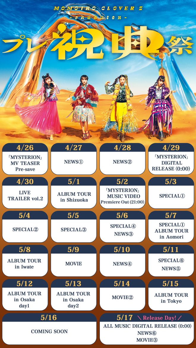 初日となる本日は、アルバムに収録される新曲「MYSTERION」のミュージックビデオTEASER映像が公開され、本楽曲の先行配信が4月29日(金・祝)に決定したことも発表された。本日の映像では、「MYSTERION」ミュージックビデオの冒頭映像を公開。砂漠に聳え立つ聖堂の中にいるメンバーが水晶を宙に掲げ、“祝典”の始まりを予感させるという内容だ。なお、ミュージックビデオのフルバージョンは、5月2日(月)21時にももいろクローバーZ公式YouTubeにてプレミア公開される。また、4月29日の配信日当日にライブラリに自動ダウンロードされる事前予約機能「Pre-save」が本日よりスタートしており、Pre-Saveをすると「MYSTERION」について話すメンバー限定動画を見ることができる。