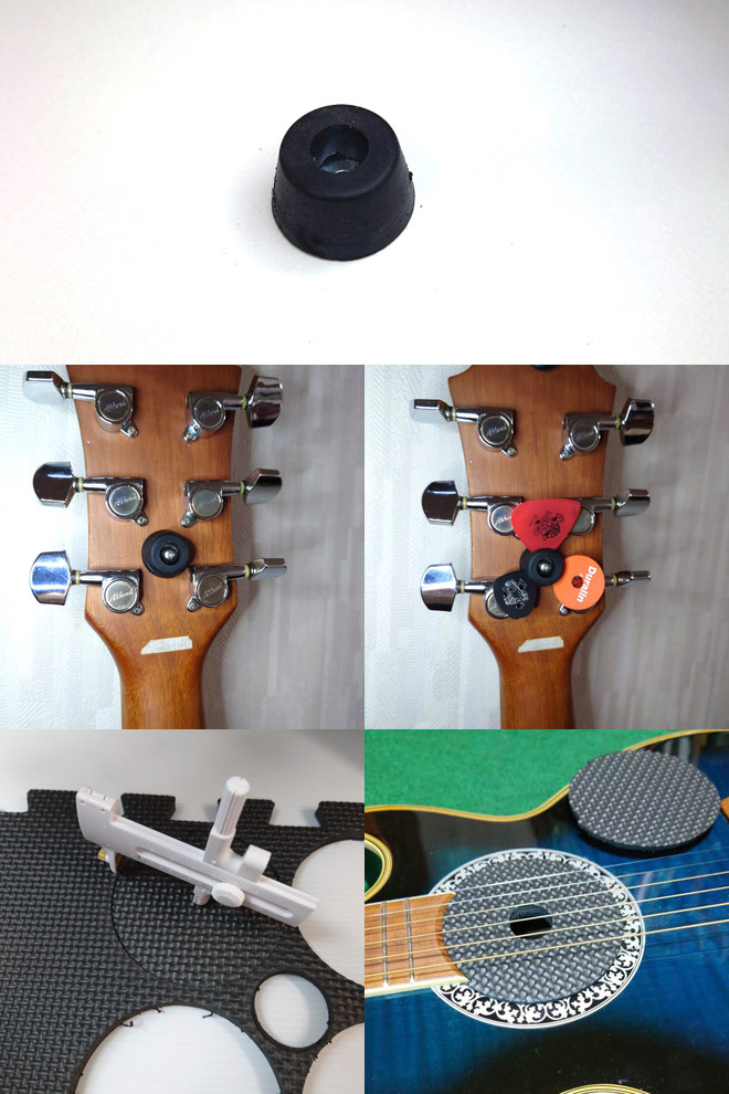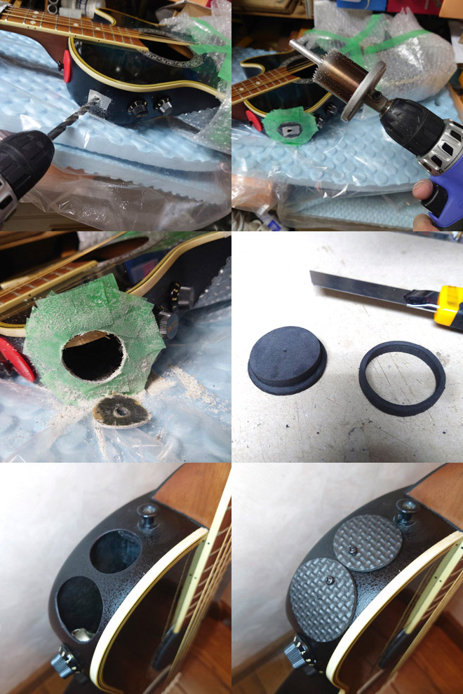 それから数ヶ月して…発症…夜中にギターを練習したい→サウンドホール・カバーが欲しい→サイズが合うのがない→作ろう!と、いうことで100円ショップのフロア・マットを円形カッターでカットして作製。様々調整のあと、小さな穴を空けてバランスを整えました。(結構、具合が良いです)