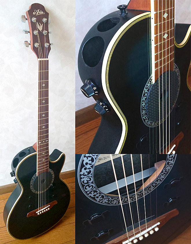 さて、今回なのですが…Aria AWB-35sという、なんの変哲もなく、定価3万円程度で販売されていた古いエレアコ、その中古品が場末のリサイクルショップにてボロボロのベタベタ状態で6千円で売られていたのですが、それがミョ~に気になって試奏→発病→購入…の由緒正しき公式によって我が家へ連れ帰りました。