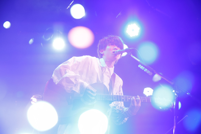 客電が一斉に落とされると、静かにステージに登場した上野大樹。2021年12月にリリースした2ndアルバム『帆がた』に収録されている「朝が来る」でライブがスタートした。
