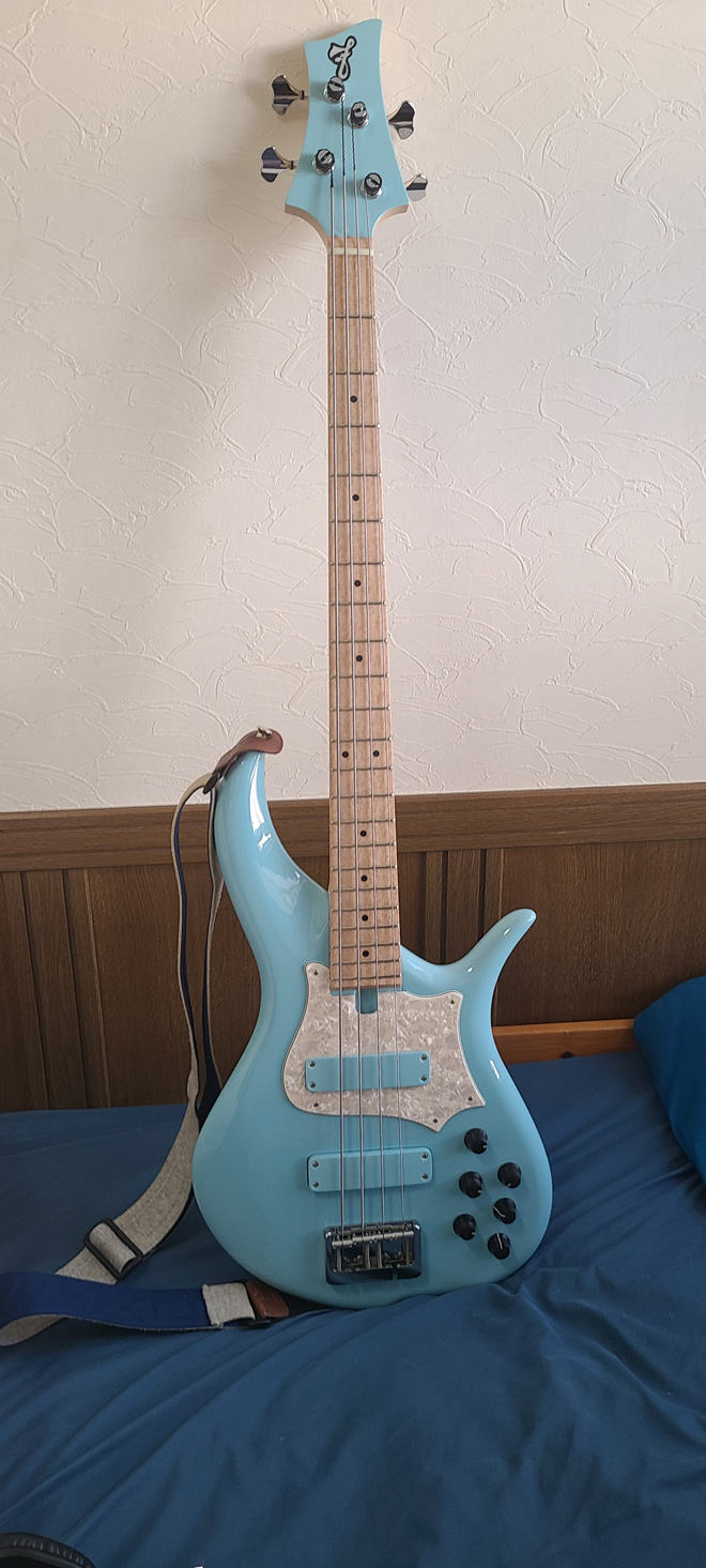 F-bassといえば、5弦、美しい木目、ピックガードがない等のイメージがありましたので、天の邪鬼な私は4弦でボディにはピックガードをつけ、色はソニックブルーの塗りつぶし、指板をバーズアイメイプルでオーダーしました(笑)。