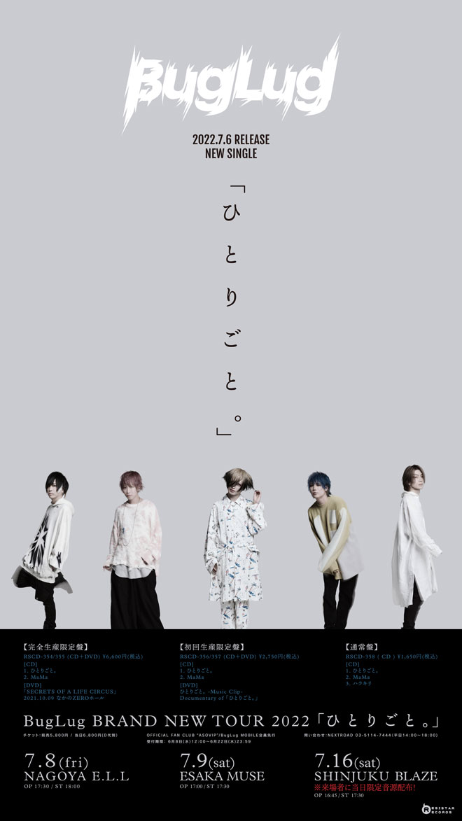 今作のリリースに伴い、作品名を冠した東名阪ツアー<BugLug BRAND NEW TOUR 2022「ひとりごと。」>も開催される。こちらは7月8日に名古屋ElectricLadyLand、7月9日にESAKA MUSE、7月16日に新宿BLAZEで開催。