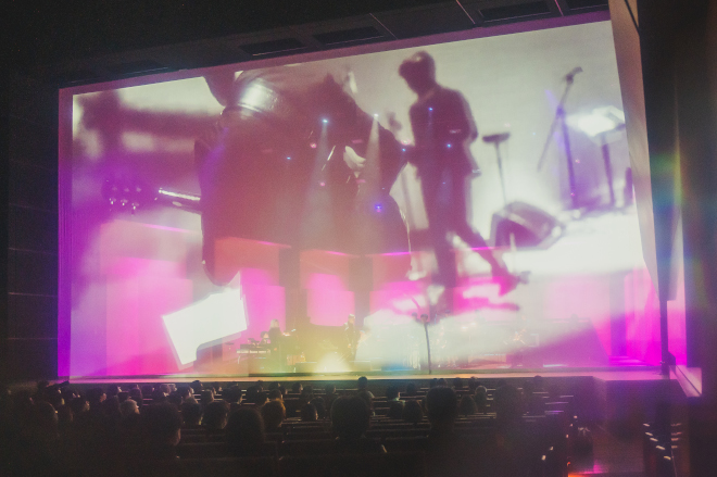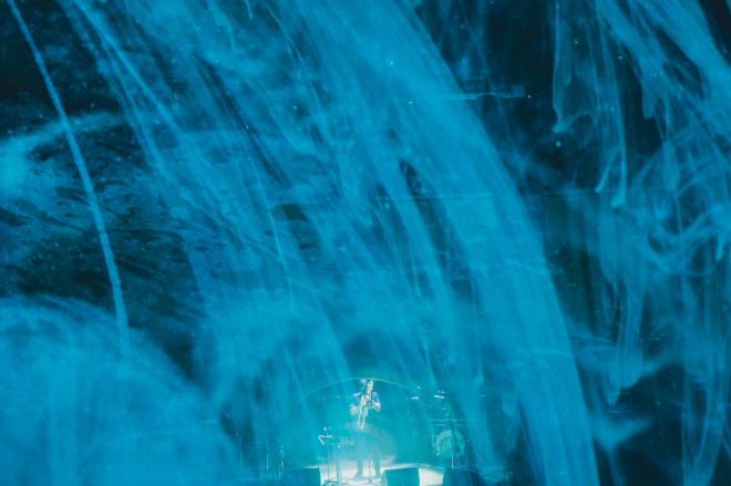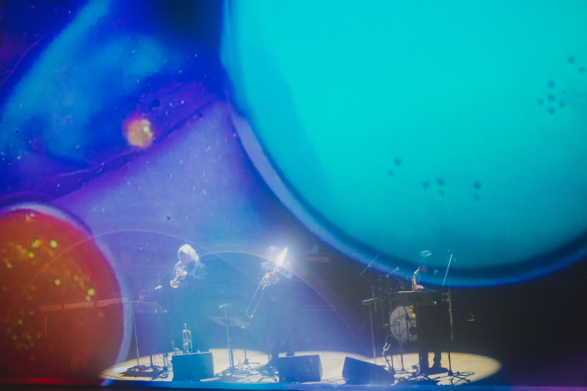 ダンスミュージックの鳴る会場。突然暗転すると中川が現れ、VJ Manami Sakamotoとのコラボレーションによる「Heaven’s Kitchen」がスタート。美しい天国にいるようなヴィジュアルが紗幕に映し出され非現実的な世界観にオーディンエンスは一気に引き込まれる。続いて川口のドラムソロから始まった「Peep」は、まさにメンバーたちを覗き(Peep)にいくような視点でカメラマンが舞台上を縦横無尽に歩き回る様子が投影。緊張感と疾走感溢れるパフォーマンスと、見事に合わさった演出に冒頭2曲ですでに今回のライブがただものでないことを確信した。