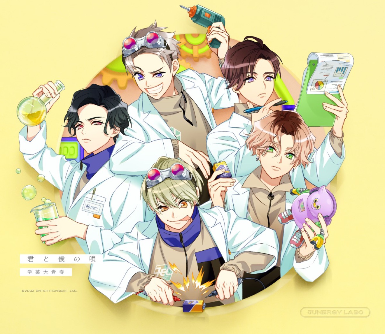 一夜が明け、本日公式HPより、この2ndミニアルバムのジャケット写真とキャラクターデザイン担当の冨士原良によるキービジュアル、またCD商品の概要も発表となった。これまでのプロダクツとは全く異なった、可愛らしいロボットがモチーフとなったジャケット写真に加え、キービジュアルでは‘科学者’的な白衣を着たメンバー5人のイラストが描かれている。