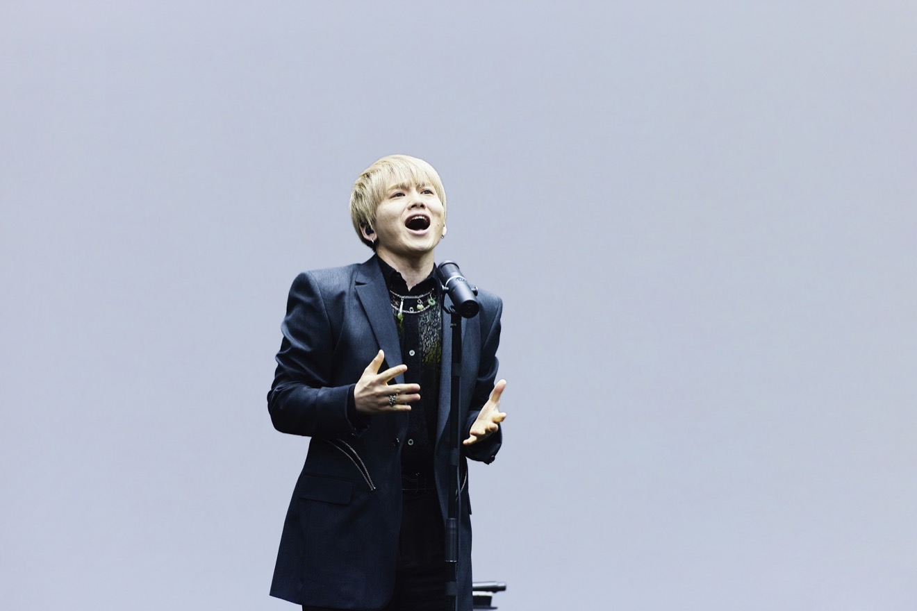 まずは大野と花村が登場。互いに目を見合わせ「行きますか」という合図で美しいピアノの音色から“必殺のバラード”「Promise」が奏でられた。二人の声が静かに、やがては力強く重なる。2021年の仮面ライダー生誕50周年記念作品『仮面ライダーリバイス』のために「過去50年(ライダー生誕の1971年)、そしてこの先50年の通年100年を股に掛けた壮大なバラードを」というオファーに応えて生まれた1曲を、圧巻のハイトーンで美しく高らかに鳴り響かせる。歌い終えると、緊張から解き放たれた大野が膝を付く場面が印象的だった。
