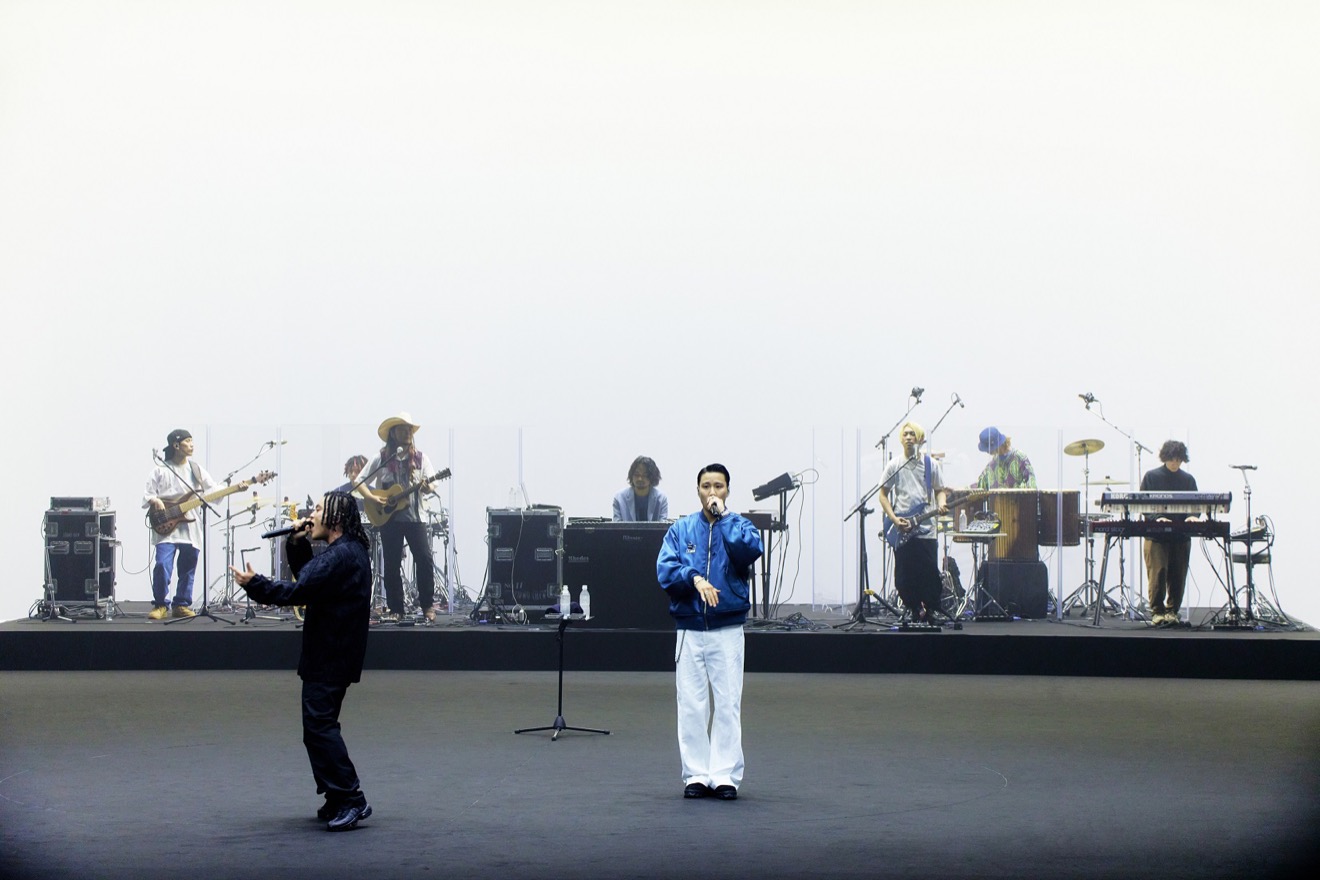 ドキュメンタリームービーが終わると、スクリーンはステージ裏で待機しているアーティストのリアルタイム映像に切り替わる。発声練習をする者、唇を鳴らす者、軽くストレッチをする者、小声で緊張をつぶやく者、メンバー間で言葉を交わす者、ひと呼吸ののちに無言でステージに向かう者とその姿も8組8色。