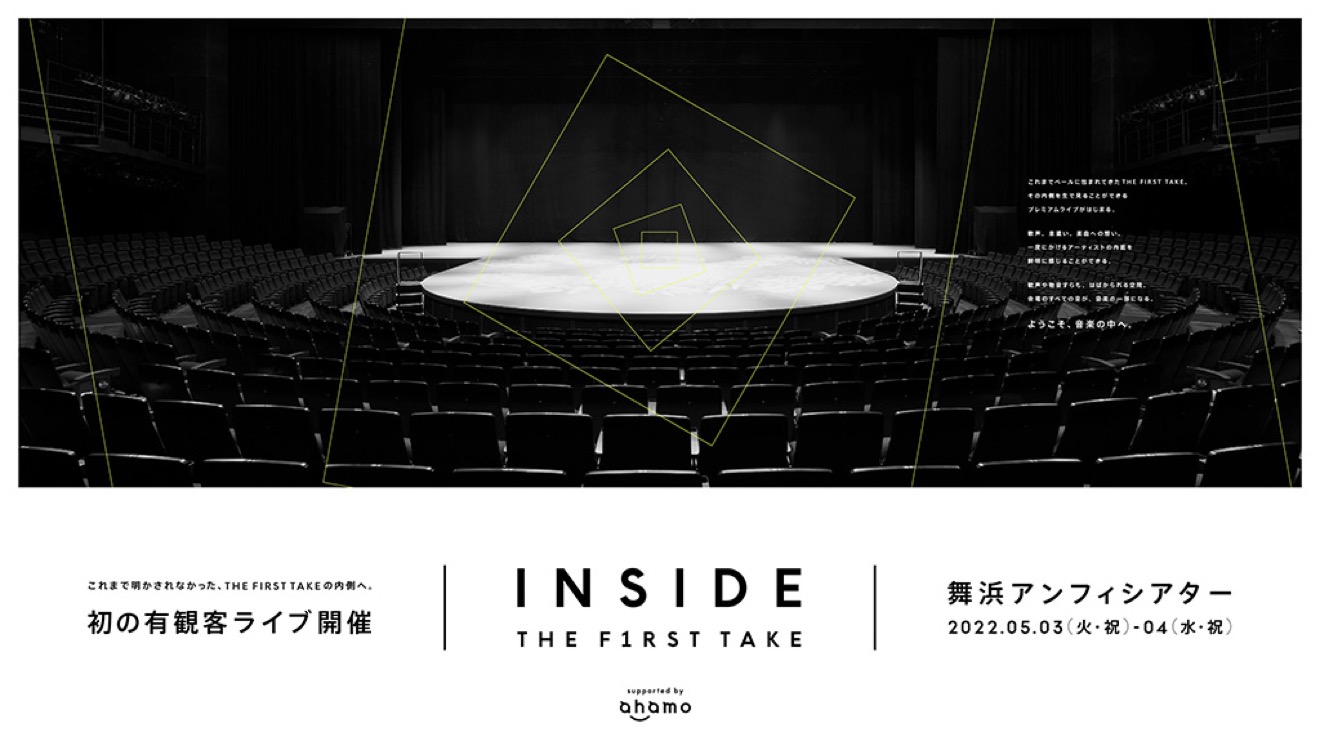 5月3日、4日、千葉県・舞浜アンフィシアターで「INSIDE THE FIRST TAKE supported by ahamo」が開催された。国内のオムニバス音楽チャンネルにおける最多登録者617万人を誇るYouTubeチャンネル「THE FIRST TAKE」にとって初の有観客ライブは「THE FIRST TAKE」の“INSIDE”(内面・内側)を4000人(2日間合計)の観客と共有するというコンセプトのもとに行われた。