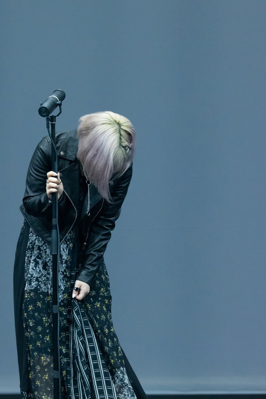 やがてステージに登場したReoNa。は、自らの思いを込めた「生きてりゃいいのよ」というリリックを繰り返し歌い上げる。小柄な彼女から放たれる、繊細で、しかし力強いメッセージがゆっくりと会場に浸透していく。そんな空気が感じられるパフォーマンスだった。2曲目は「たくさんの出会いと思い出をくれた」というTVアニメ『ソードアート・オンライン アリシゼーション War of Underworld』のオープニングテーマ「ANIMA」。ピアノとギターから繰り出される激しい旋律に身体を揺らしながら訴えかけるような力強いボーカルを轟かせる。そして最後は「逃げ出したい誰かの、痛みを抱える誰かの、心の内側に、言葉にできない想いに、寄り添えますように」と語り、新作E.P.「Naked」の収録曲「Someday」を披露。スカートの裾を強く握りしめる様子をカメラが捉える。苦しみから“逃げ出した”先に見える“生きる希望”を振り絞るように3曲の「お歌」を歌い上げたReoNaの歌声に、彼女を見守るように聴き入っていた観客からあたたかな拍手が巻き起こった。