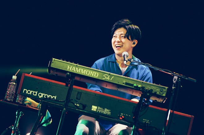 「ふっかつのじゅもん」では黒田が前へ出て華々しいギターソロで魅了。後半はsumikaのエッジーな側面が顔を覗かせ、ダークなエレクトロ要素を打ち出した「Babel」、ジャジーで艶やかな「Stawberry Fields」は荒井の繰り出すビート感が心地よい。一連の流れで深遠な世界へと誘った後は、アカペラでコーラスをする際にメンバーが顔を見合わせる姿が微笑ましかった「Summer Vacation」、そして圧倒的なメロディーの美しさに聴き惚れた「願い」。sumikaというバンドの多面的な魅力が、セットリストにしっかりと反映されていた。
