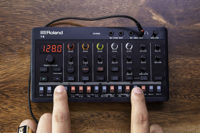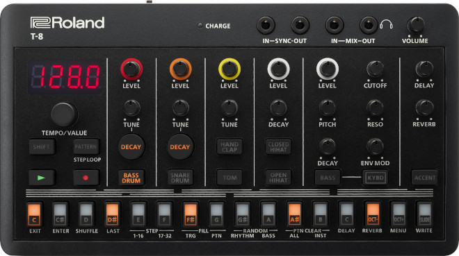 最新のエレクトロニック・ミュージックでも多用される、象徴的なローランドのドラム/ベース・サウンドを、どこにでも持ち運べるコンパクトなボディに搭載。ACB(※)によって忠実に再現された、名器と呼ばれるリズムマシン「TR-808」「TR-909」「TR-606」と、ベース・シンセサイザー「TB-303」のサウンドを組み合わせて楽曲を構築できる。リズムを打ち込むドラム・シーケンサーは、6つトラックを持ち、上記の「TRシリーズ」で採用された「TR-REC」と呼ばれる操作システムを装備。操作を止めずにアイデアを形にできる。さらに、「ステップ・ループ」、「パターン・シフト」、「プロバビリティ」などのさまざまな内蔵ツールを駆使することで、ダイナミックなパフォーマンスを実現。また、『T-8』は、「TB-303」から受け継いだノコギリ波・矩形波と操作性で、特徴的なベース・サウンドを直感的に調整・加工できる。