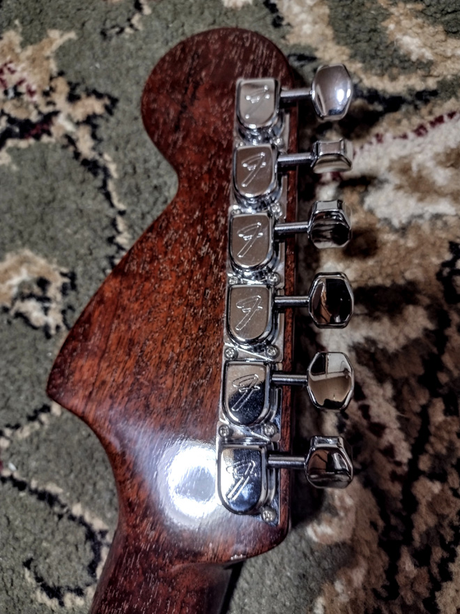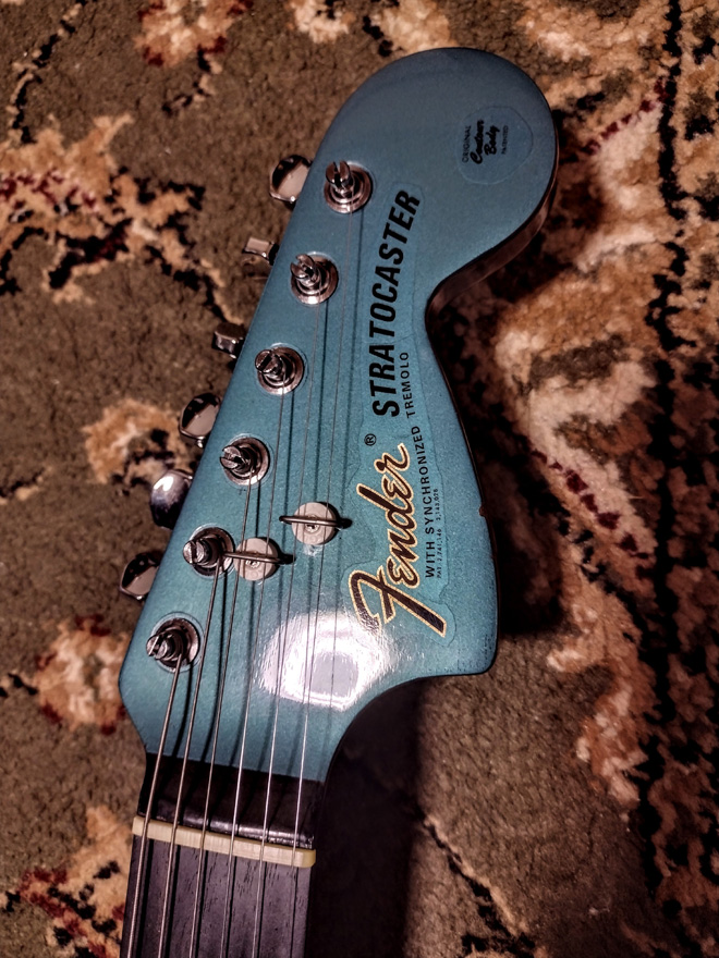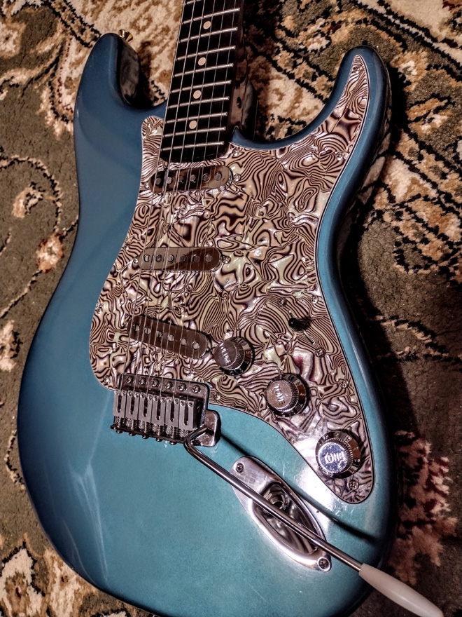 元々はビンテージノイズレスPUでミッドブースト付き、アノダイズドゴールドのピックガードが付いていて、2点支持のブリッジ、スパーゼルペグでした。見た目気に入り買って暫くそのまま使ってたんですが、ど~もワシの好きなストラトの音じゃない(笑)。