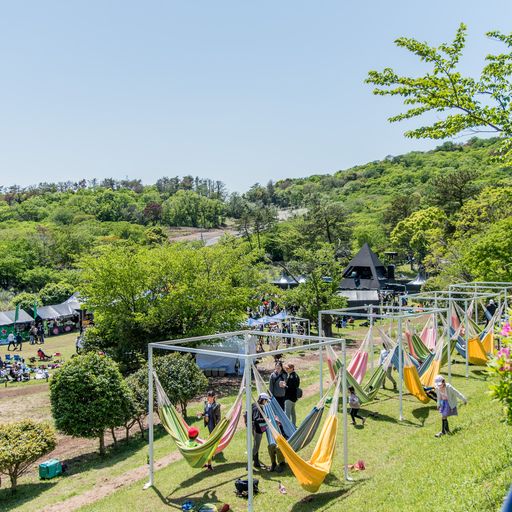 3年ぶりに行動制限のないゴールデンウィークとなった今年。普段はクロスカントリー等で利用されるなど、緑に囲まれ伸び伸びと楽しめる会場はキッズエリアやハンモックエリア、そして地元の食材も使った店も並ぶフードエリアもあり、小さな音楽好きのビレッジのようなピースフルな景色が広がっていた。
