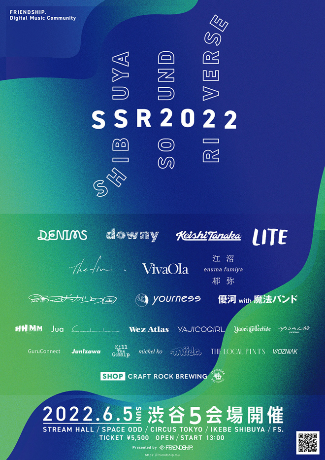 <SHIBUYA SOUND RIVERSE 2022>は、HIP LAND MUSICによる音楽ディストリビューションサービス「FRIENDSHIP.」のサービスローンチ3周年を記念して、STREAM HALL、SPACE ODD、CIRCUS Tokyo、IKEBE SHIBUYA、FS.の5会場で開催されるイベント。今回出演が明らかになったのは、踊ってばかりの国とmiidaの2組だ。この発表で全アーティストが出揃った。