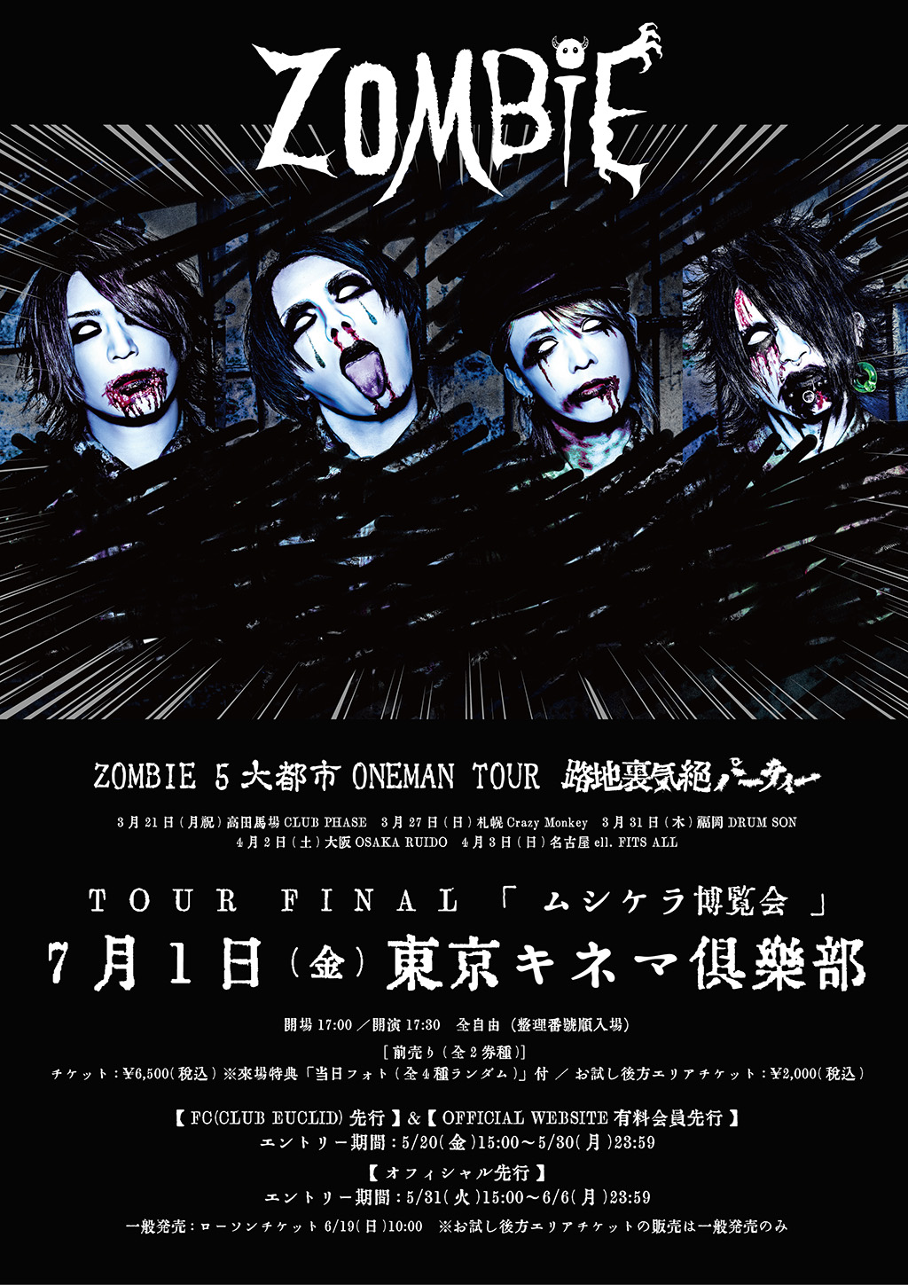ZOMBIEが5大都市 ONEMAN TOUR<路地裏気絶パーティー>のツアーファイナルとなる、東京キネマ倶楽部公演「ムシケラ博覧会」の詳細を発表した。