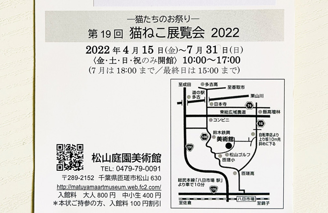 7/31まで、千葉県匝瑳市にある松山庭園美術館で展示してます。日本各地から、猫好きの作家さんの作品を色々見られる楽しいイベントです。可愛いニャンコ達とお待ちしてニャース。