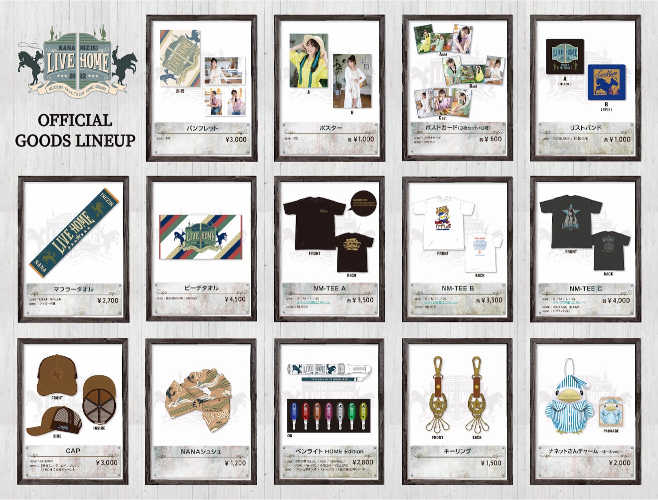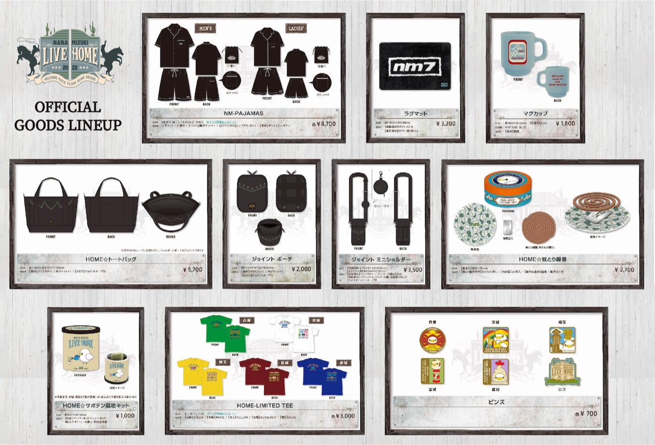 特設サイトでは全25種のグッズラインナップを公開。ペンライト、タオル、Tシャツ、パンフレットなどの定番グッズに加え、マグカップ、ラグマット、キーリングに、上下セットのパジャマ「NM-PAJAMAS」やパジャマ姿の「ナネットさんチャーム〜ほーむver.〜」、「HOME☆サボテン栽培キット」など、「HOME」というライブタイトルから“家”にちなんだグッズが発売となる。さらに夏ツアーということから、CAPやビーチタオル、「HOME☆蚊とり線香」といった夏に欠かせないアイテムもラインナップされた。