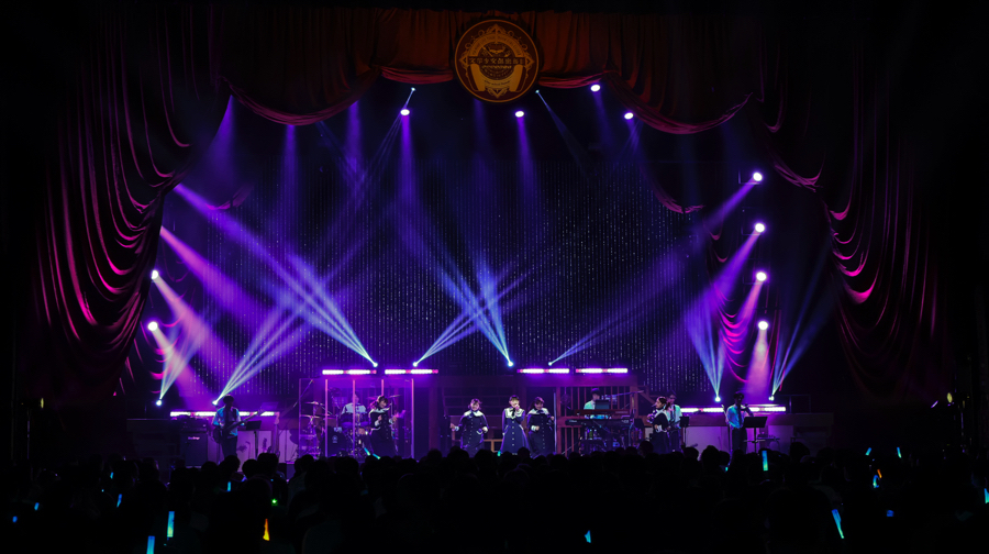 ステージには先ほどの幕間映像に登場した看板が出現し、ラクガキ風のペイントが施された衣装の堀江が登場。幕間映像とステージ上の現実がリンクする遊び心満載な仕掛けもありつつ、「The♡World’s♡End」では、目まぐるしい旋律に乗せ圧倒的なボーカル&表現力で客席を魅了。「ヒカリ」では劇団員を統率するように堀江がペンライトを高く掲げ、会場を熱狂の渦に巻き込んでいった。