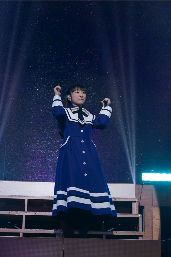 物語も終盤へ。幕間映像で“放課後リピート”という今回のライブタイトルの所以も明らかになると、ステージにはライブ冒頭と同じ制服風の衣装を纏った堀江が登場。「CHILDISH♡LOVE♡WORLD」で劇団員たちがカラフルなペンライトと手拍子で“フレー!フレー!ほっちゃん!”のフレーズを表現しながら盛り上げた後、本編ラストに披露されたのは、最新アルバムから卒業をテーマにした楽曲「スタートライン」。ピアノの旋律に乗せ堀江のイノセントなボーカルが会場に響き渡ると、客席も一気に引き込まれていく。徐々に壮大になっていく演奏そしてダンスパフォーマンスも相まって、感情昂る締めくくりとなった。