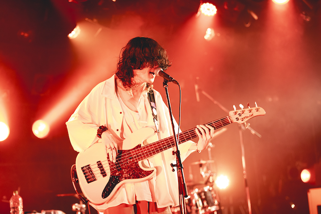 「茜色、空に灯す」になれば、今度は赤く染まったステージで躍動する4人。「ここはライブハウスだ!」と衝動を抑え切れない様子で叫ぶ平田も、拳が突き上がるフロアを食い入るように見つめながらメロディアスなフレーズを弾くカワカミも、全体をどっしりと支えるリズム隊のイシヅカと高橋も、実にいい表情を浮かべてこの瞬間を楽しんでいる。
