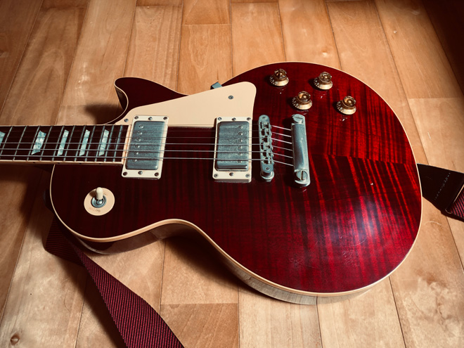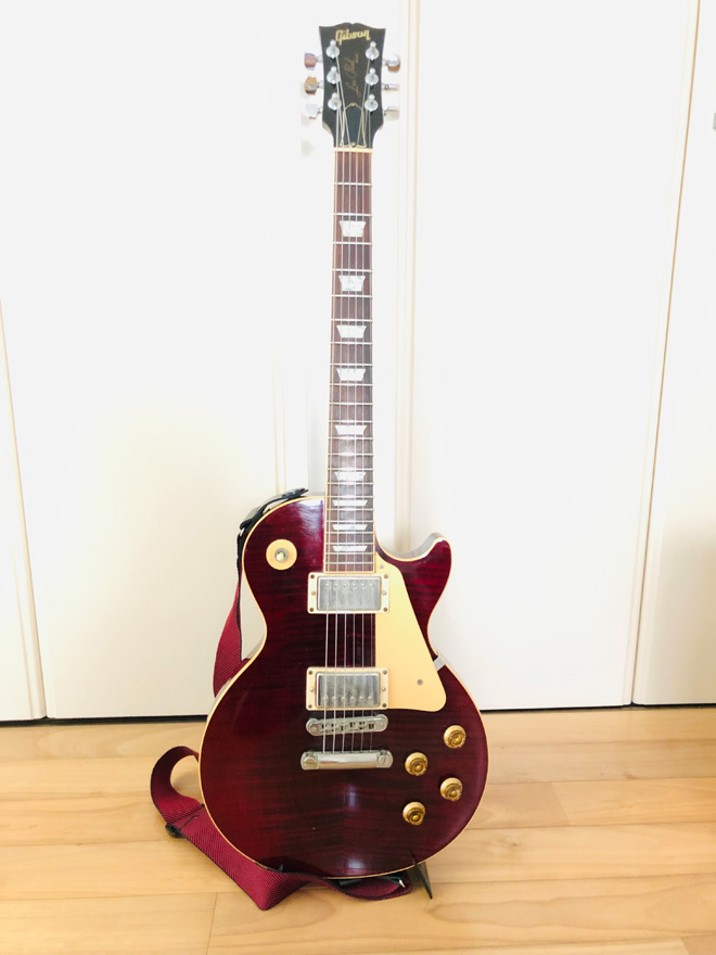 ジェフベックが大好きすぎて、大枚叩いて手に入れたオックスブラッドのレスポール。でも、日が経つにつれて、薄れていく愛着。なんでやろ、、、ジェフベックは大好きで憧れのギタリストだけど、ジェフベックのように弾けるわけないし(当たり前)ジェフベックだからこのギターは映える。そう思い始めたら、自分色のレスポールを手に入れたいとの気持ちが強くなって、そのオックスブラッドを売りに出して、買ったのがこのワインレッドのレスポールです。オックスブラッド、売るとかもう変人ですね、、、でも一切後悔してません。