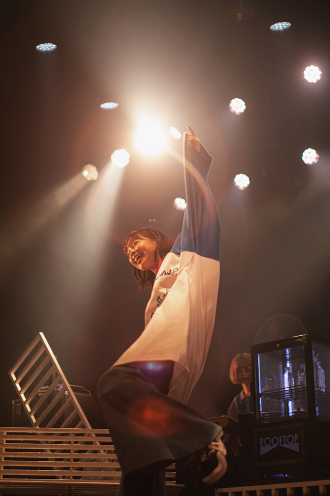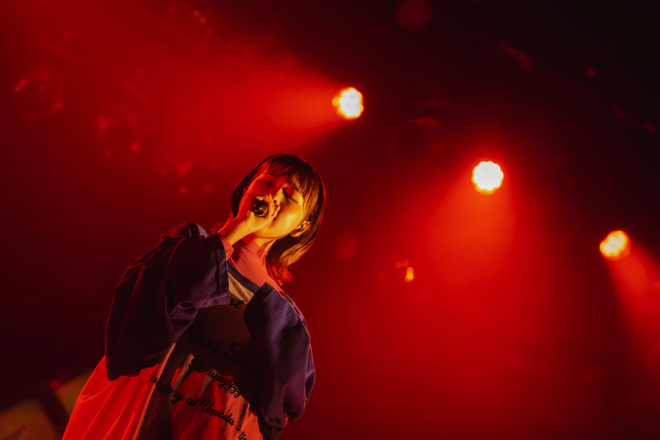 5月21日(土)に開催された地元大阪の心斎橋BIGCATでのライブは、十代白書2020でグランプリを獲得した際と同じステージにワンマンライブで戻ってきたasmiが大きな拍手で迎えられ、温かいムードに包まれながら「Call me」からスタート。中盤に披露された「lemon tea」の前には、ステージに設置されたベンチにasmiが座り、そっと傘を差す。歌が始まると、突如傘が蛍光色に彩られ、ステージセットも同じく煌びやかな蛍光色で光り輝いた。