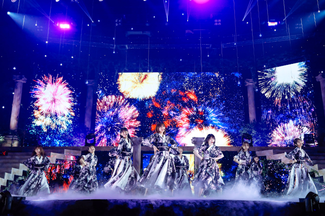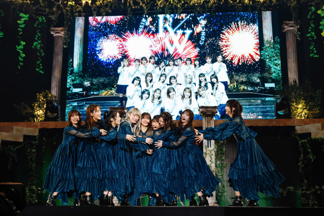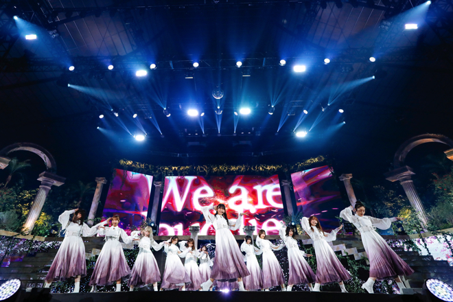 このクライマックスは、その後も曲ごとに更新され続けることに。2期生によるMCを経て、ステージにひとり現れた渡邉。スクリーンに映し出された欅の木を見つめていると、そっと手を上げて欅坂46の名曲「二人セゾン」に突入する。この意外な選曲に、客席から驚きの声が漏れ始める。現在グループに在籍する1期生9名で披露されたこの曲では、明るくも切ない曲調とともに、心の底から湧き上がるメンバーの笑みが印象に残り、落ちサビでのソロダンスを渡邉が担当するなど、彼女のラストステージにふさわしい演出も用意。また、「僕たちの戦争」では渡邉、上村莉菜、土生瑞穂というユニット“FIVE CARDS”のオリジナルメンバー3人が、トロッコを使って会場を回遊。この演出は「青空が違う」にも引き継がれ、渡邉と菅井友香が客席に向けて笑顔を送り続ける。1期生が再びステージに勢揃いすると、自身の青春時代を振り返るような「制服と太陽」でノスタルジーに浸り、「世界には愛しかない」では一面青く染まった会場に向けてステージからポジティブなメッセージが届けられた。