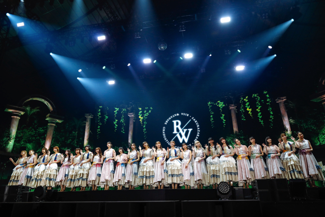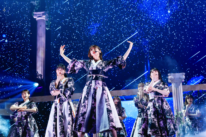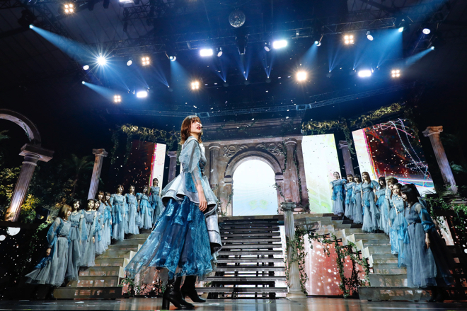 渡邉にとって櫻坂46最後のライブとなった22日公演では、「Overture」が爆音で流れたかと思うと、続いて水の滴る音とともに静寂が訪れる。すると、宮殿のようなステージセットに櫻坂46メンバーが姿を現し、最後にアーチから渡邉が登場。その彼女がセンターを務める「無言の宇宙」から、ライブはゆったりとスタートした。儚さと壮大さを併せ持つこの曲は、彼女のラストステージの幕開けにふさわしいものであり、渡邉のメンバーカラー=青&白のペンライトとともに、早くも特別な空間が作り上げられる。また、曲のエンディングでは欅坂46時代から現在に至るまでの思い出の写真がスクリーンに映し出され、エモーショナルさがさらに増していった。