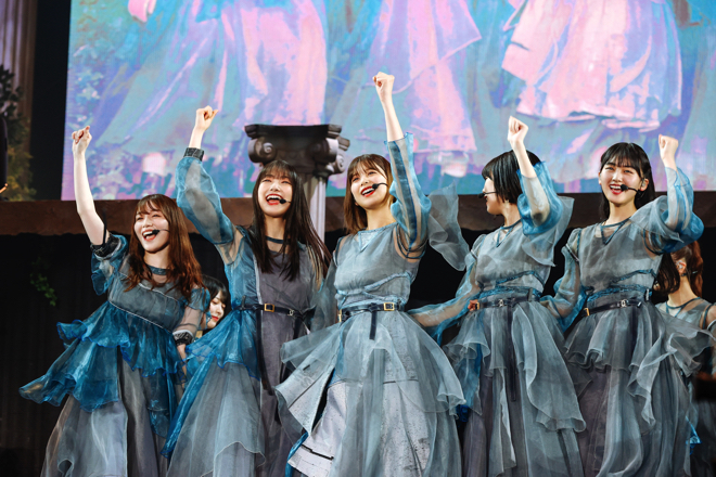 モデル/女優の新木優子や『そこ曲がったら、櫻坂?』のMCを務める土田晃之&澤部佑と、渡邉と馴染みのある面々からのメッセージ映像に続いて、スクリーンには青い月が映し出される。すると、ステージ上空から釣られたブランコに乗る渡邉が姿を現し、そのまま「ブルームーンキス」に突入。曲中のセリフパートでは、センターの森田ひかるが渡邉に抱きつき「理佐さん大好き!」と仲睦まじい姿をアピールする一幕もあり、再び会場は和やかな空気に包まれていく。また、「偶然の答え」ではセンターの藤吉夏鈴が憂いに満ちた表情で楽曲の世界を表現。続く「なぜ 恋をして来なかったんだろう?」でも、さらに頼もしいパフォーマンスを提示していく。これは彼女に限ったことではなく2期生全員に言えることで、その佇まいや堂に入ったパフォーマンスからは渡邉に安心して卒業してもらおうとする彼女たちの成長と優しさが伝わってきた。
