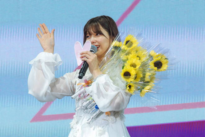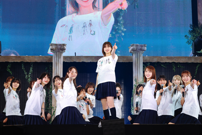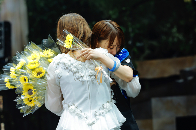 続いて、ステージに合流した1期生が渡邉にメッセージを送る。上村や齋藤冬優花、尾関梨香、小林由依がそれぞれの思いと感謝を口にすると、その流れで渡邉と菅井がユニット“青空とMARRY”の楽曲をメドレーで披露。2人寄り添って回廊を歩きながら歌うその姿は、この貴重な時間を心底楽しんでいるように映る。メンバーが再び勢揃いすると、「太陽は見上げる人を選ばない」でグループの絆をアピールし、最後は渡邉の「みんなで騒げー!」を合図に「危なっかしい計画」で笑顔を振り撒きながらライブは終焉。会場のBuddiesに向けて挨拶をすると、客席からは「7年間ありがとう」のメッセージが添えられた用紙が掲げられるサプライズが。驚きつつも喜びの笑みを浮かべる彼女は、トロッコに乗ってスタンド席を一周する。そこからステージに戻ると、今度はヒマワリの花を一輪ずつ持ったメンバーの姿が。何も聞かされていなかったこのサプライズに驚きの声を上げるも、そのまま渡邉はメンバー1人ひとりから感謝の言葉とヒマワリの花を受け取り、約3時間におよぶグループ初の卒業コンサートは幕を下ろした。