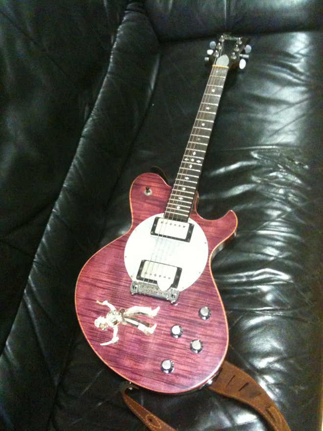 これは試作品とのことで、オリジナルデザインで製作発注出来るとの事だったがあまりにも高価すぎてオリジナル発注は断念。一晩考えた末、フェンダーカスタムショップのストラト、ミュージックマンのシルエット、Kids Guitarの偽ゼマイティスの3本を下取りに出した上で数十万円支払って手に入れた。