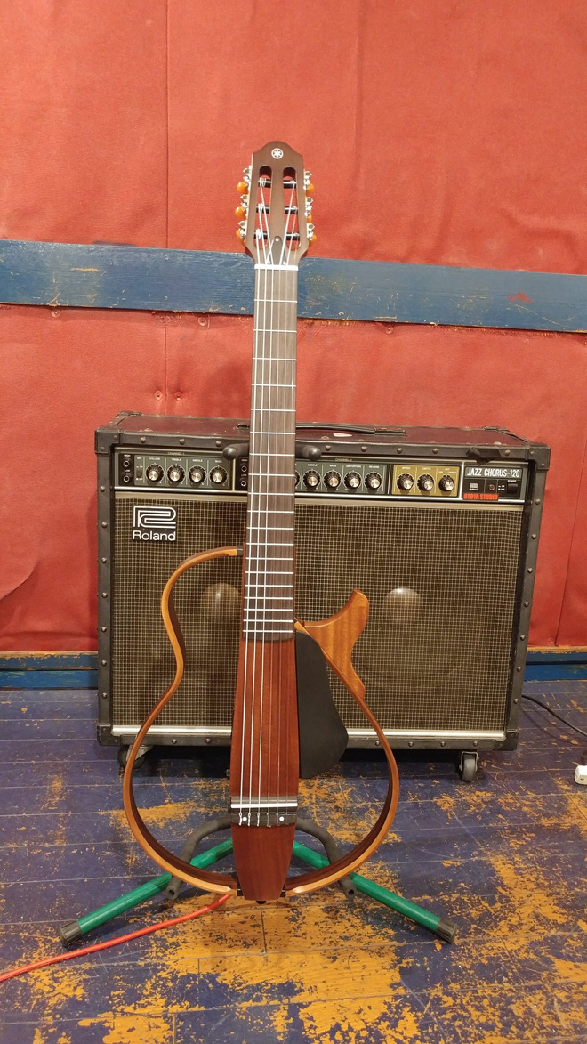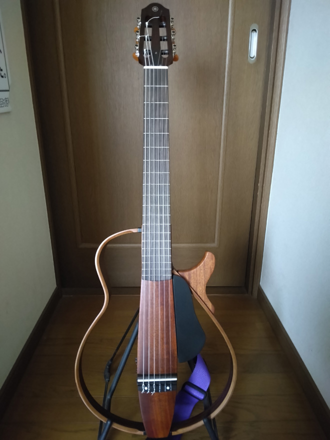 ナイロン弦の独特の音色とガットギターの指板の幅広さが好きな反面、ハウリングやサスティーン不足に悩んでおり、そこを解決する方法を試行錯誤してたところ、ふと楽器店でサイレントギターを目にして「もしかして、これならハウリング問題は解決するんでは?」と思い立ち、試奏。操作性・音質は全く申し分なく、数日後には購入してました。