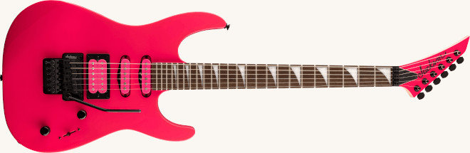 節約家のミュージシャンのために作られたJackson X Series Dinky DK3XR HSS。ニヤトーボディのDK3XRは、速弾きプレイヤーのためにヒールカット加工され、ハイポジションへのスムーズなアクセスが可能な、滑らかなプレイアビリティをもたらすサテンバックフィニッシュ、演奏時の疲労を軽減するスカーフジョイント、気候や環境の変化でも安定性を保つグラファイト補強を施したボルトオン式メイプルネックを備える。24本のジャンボフレット、反転したパーロイドシャークフィンインレイを特徴とする12インチ-16インチのコンパウンドラジアスにロールエッジ加工されたローレル指板は、ヘヴィなコードワークと高速なソロに適している。HSS構成のDK3XRはすべてJackson製ピックアップを搭載。Jackson high-outputハムバッカーピックアップは、オーバードライブとサステインを最大限に引き出し、センターとフロントに搭載されたJacksonシングルコイルピックアップは、ストラトサウンドをもたらす。5ウェイブレードスイッチ、ボリュームとトーンコントロールでサウンドメイクでき、Floyd Rose公認のJackson製ダブルロッキングトレモロブリッジシステムを採用。カラーはCaution Yellow、Neon Pink から選べ、いずれもリヴァースのJackson pointed 6-in-lineマッチングヘッドとブラックのハードウェアを備える。Caution Yellow モデルにはピンクのピックアップボビンとピンクのジャクソンロゴ付きヘッド、Neon Pink にはピンクのピックアップボビンとブラックのジャクソンロゴ付きヘッドを装備している。